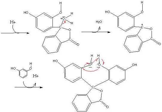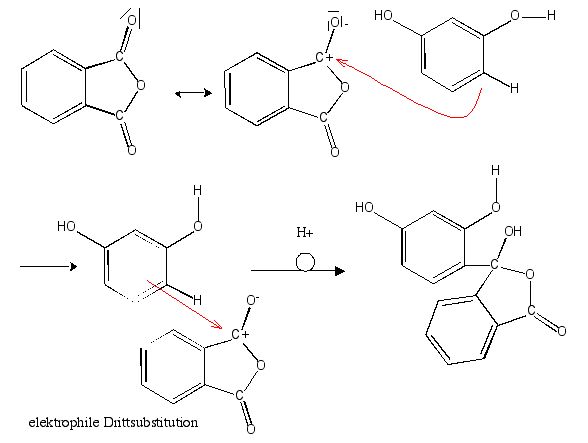 0,5 g Phtalsäureanhydrid, 1 g Resorcin und etwa 2 g wasserfreies Zinkchlorid werden vorsichtig zur Schmelze erhitzt. Nach dem Abkühlen wird das Schmelzgut mit 3 ml Natronlauge geschüttelt. Die Lösung gibt man in ein Becherglas mit Wasser.
