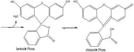 Da die freie Verbindung farbig ist, nimmt man an, dass die Struktur der Moleküle chinoid (im Gegensatz zu lactoid (Lactone sind cyclische Ester); dann sind sie nämlich, aufgrund des Unvermögens Mesomerien auszubilden, farblos) ist.