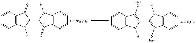 |  | Indigo: blau, wasserunlöslich | Indigweiß oder Leukoindigo: farblos, wasserunlöslich | |||