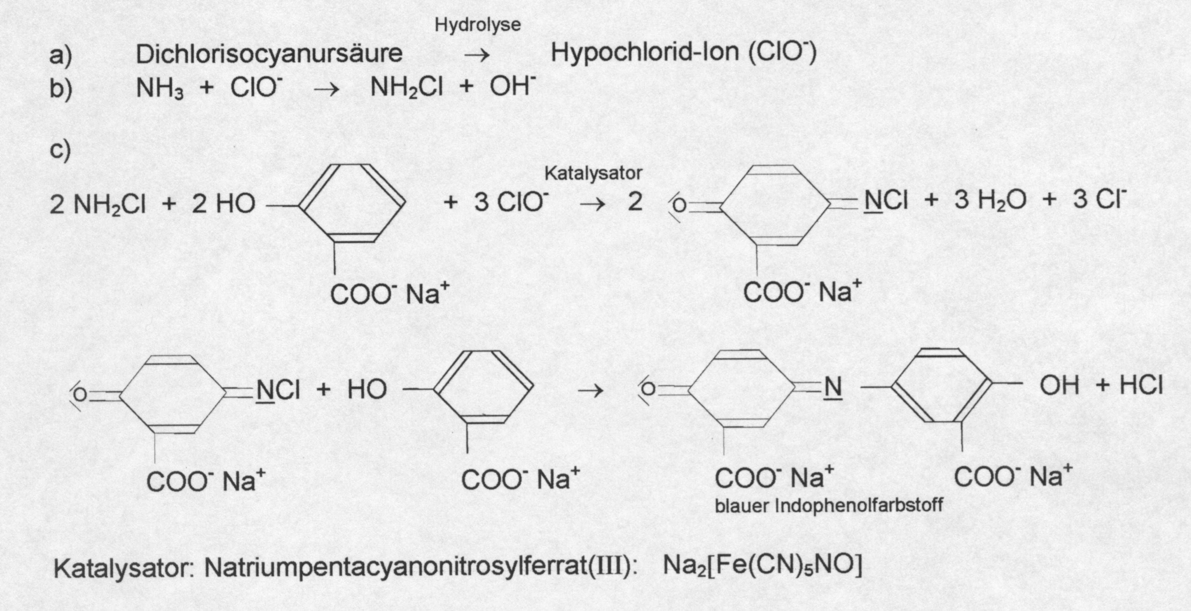 Die Nachweisreaktion läuft in stark alkalischem Medium bei pH 13 ab. Bei diesem pH-Wert liegt der Ammonium-Stickstoff vollständig als NH3 vor. Ammoniak reagiert zunächst vollständig mit Hypochlorid-Ionen (ClO-), die bei der Hydrolyse von Dichlorisocyanursäure gebildet werden (a), zu Monochloramin (NH2Cl) (b). Dieses reagiert dann unter der Wirkung eines Katalysators mit Natriumsalicylat zu einem blauen Indophenolfarbstoff (Berthelot-Reaktion). Die folgenden Reaktionsschritte werden angenommen:2