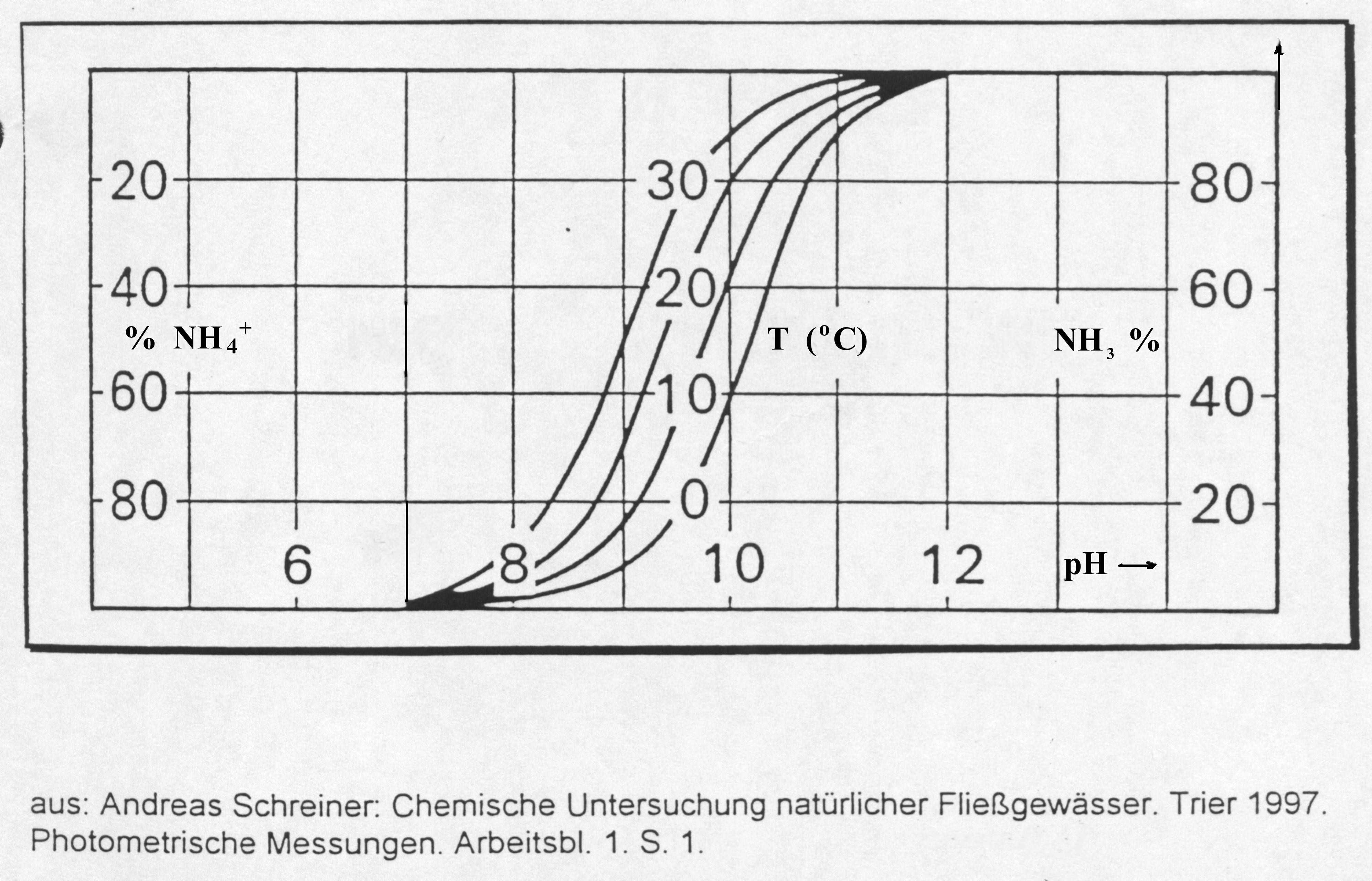 In wässrigen Lösungen findet man ein vom pH-Wert abhängiges Gleichgewicht zwischen Ammonium-Ionen und freiem Ammoniak (Anhang 7). Das fischgiftige Ammoniak ist nur in alkalischem Wasser beständig. In saurem Wasser bildet sich das ungefährliche Ammonium-Ion.2 Neben der Abhängigkeit vom pH-Wert ist das Gleichgewicht zwischen Ammoniak und Ammonium auch von der Temperatur abhängig. Zur Beurteilung der Fischgiftigkeit einer bestimmten Ammoniumkonzentration ist neben der pH-Messung auch eine Temperaturmessung notwendig.