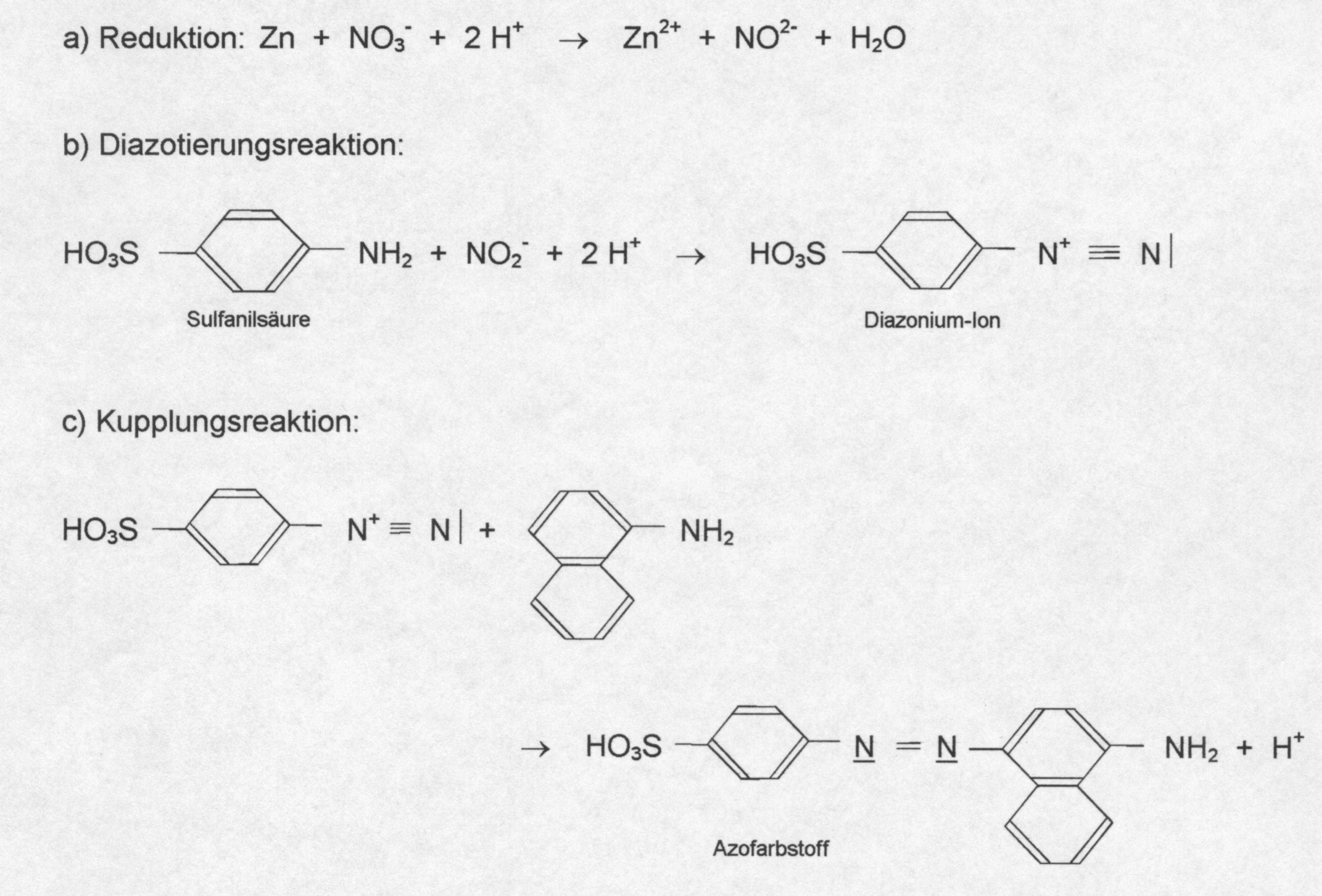 werden die Nitrat-Ionen zu Nitrit-Ionen reduziert (a). Diese wiederum reagieren