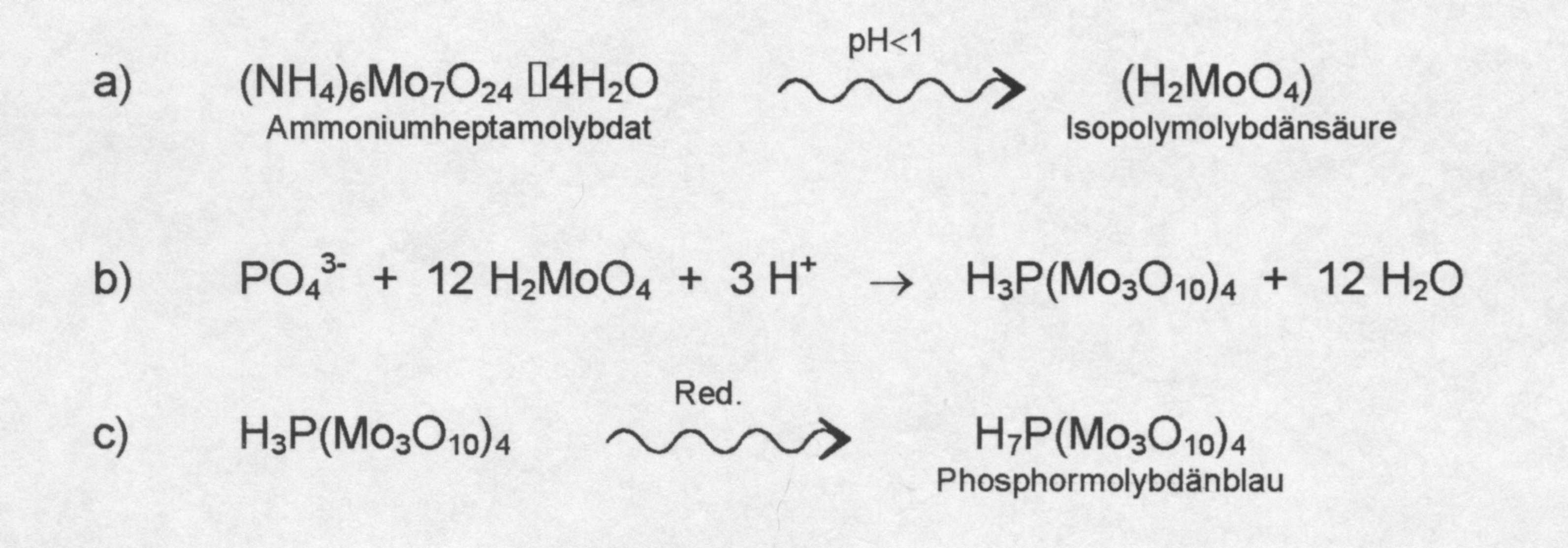 Die Nachweisreaktionen laufen in stark schwefelsaurer Lösung bei pH< 1 ab. Bei diesem pH-Wert bildet sich aus Ammoniumheptamolybdat zunächst Isopolymolybdänsäure (a), die mit Phosphaten zu Phosphormolybdänsäure reagiert (b), wobei die vier O-Atome des Phosphats durch vier (Mo3O10)-Gruppen ersetzt werden. Anschließend erfolgt die Reduktion zu Phosphormolybdänblau (c).